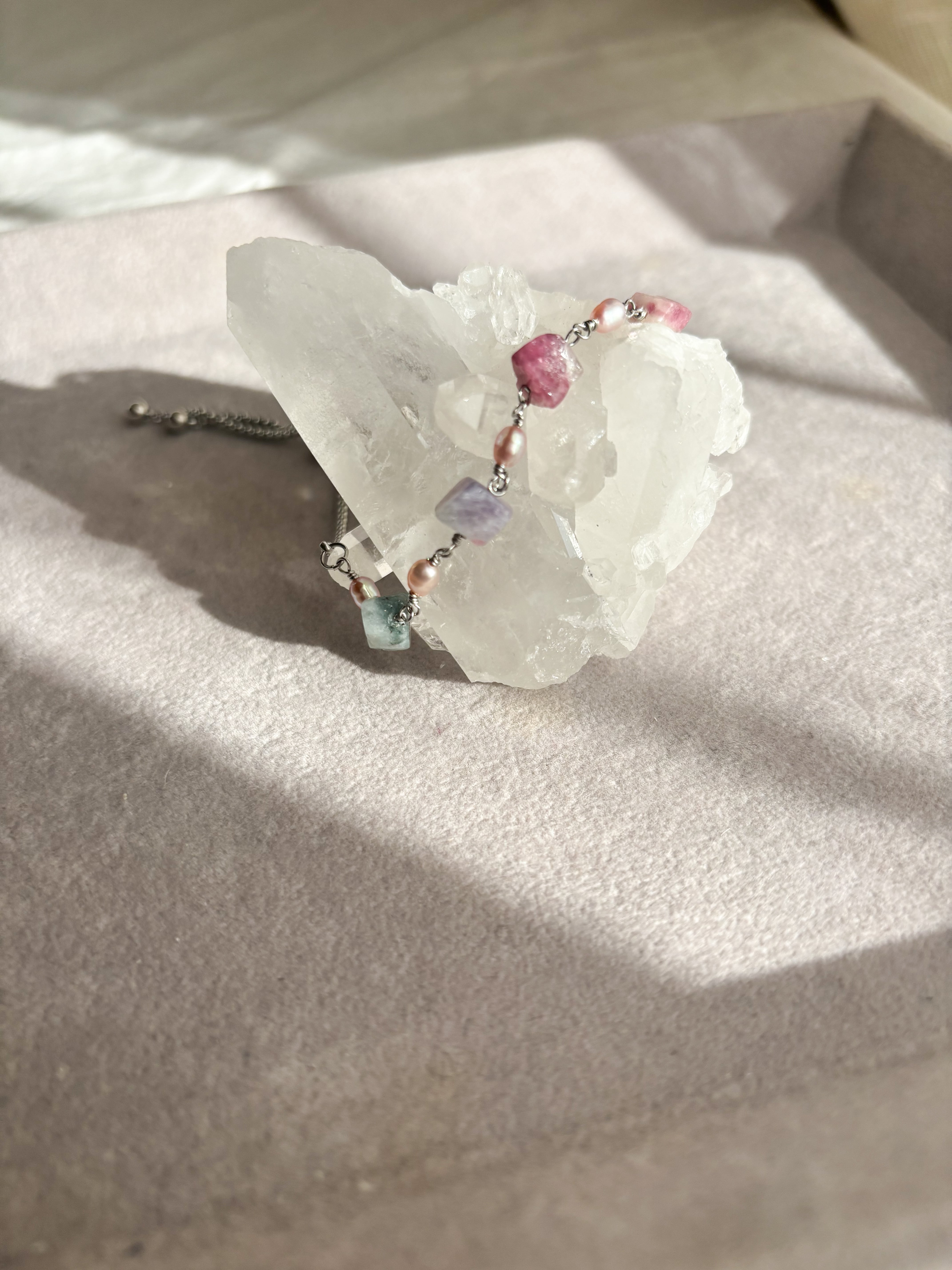 マルチトルマリンと淡水パールを使ったブレスレット。トルマリンはストレスの軽減、心身の浄化などの効果があるとされています。