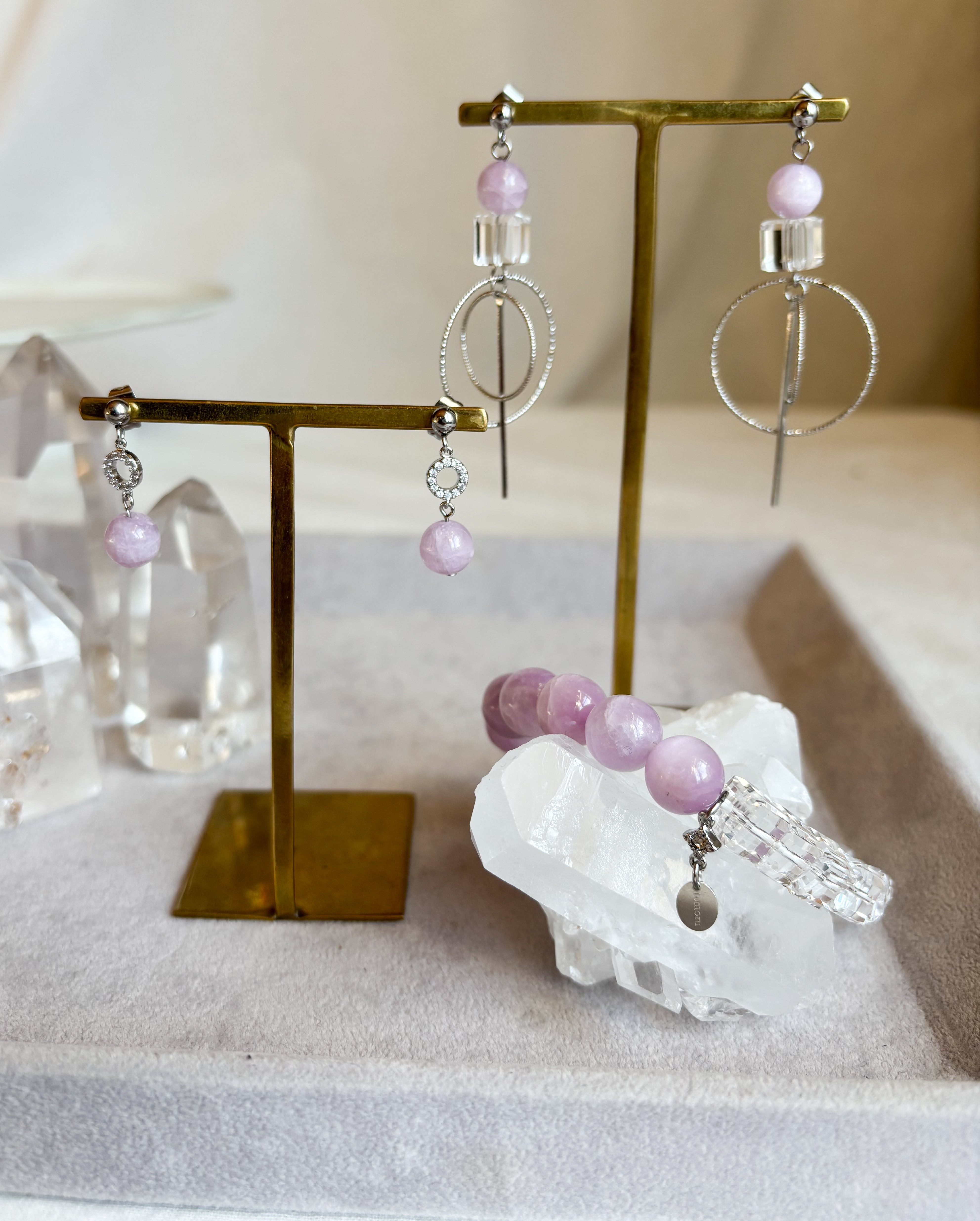 大ぶりで、個性的な存在感のクンツァイトのピアスイヤリングです。サークルパーツやメタルバーを組み合わせて、身に着けているだけで強い気持ちになれそうなオーラを放っています♡