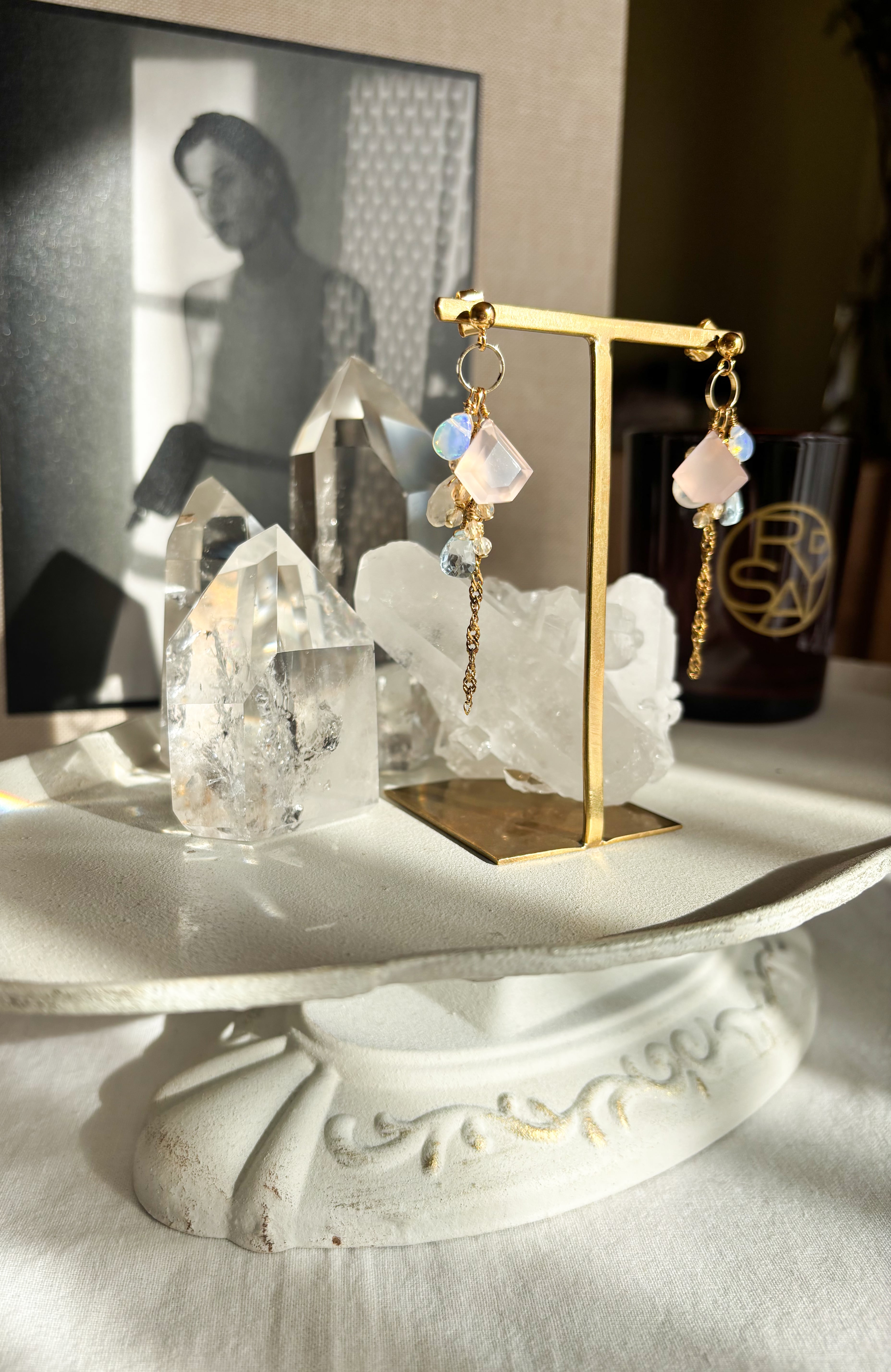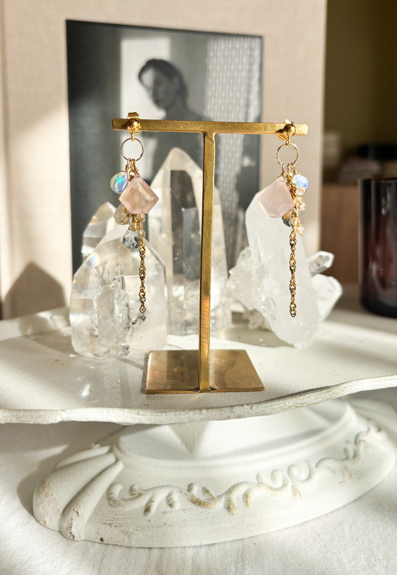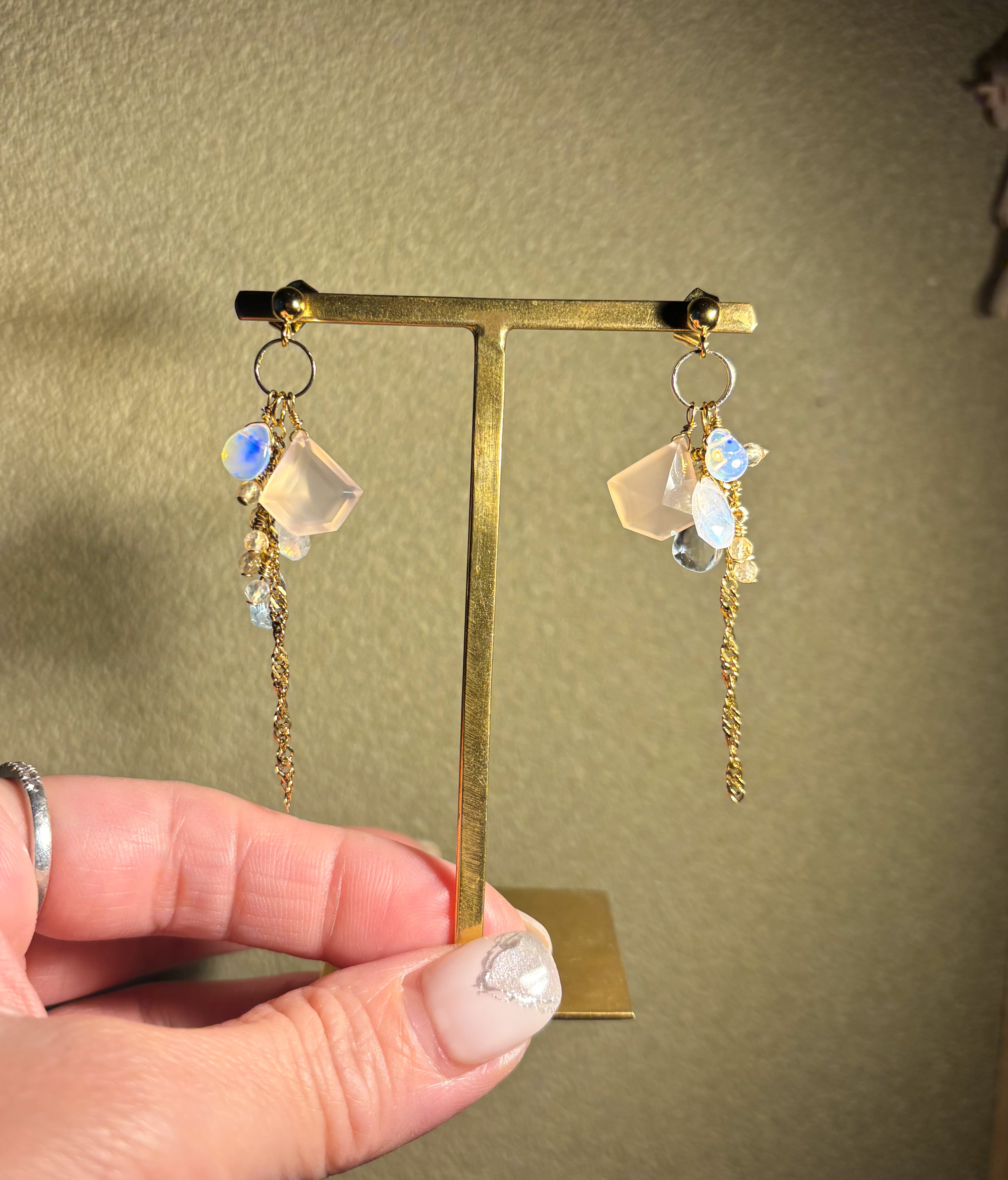 ペンタゴン型のピンクカルセドニーに、オパールやブルームーン、スカイブルートパーズとシトリンも合わせてゆらゆらと、色合いが春らしく軽やかなデザインのピアスイヤリングです。