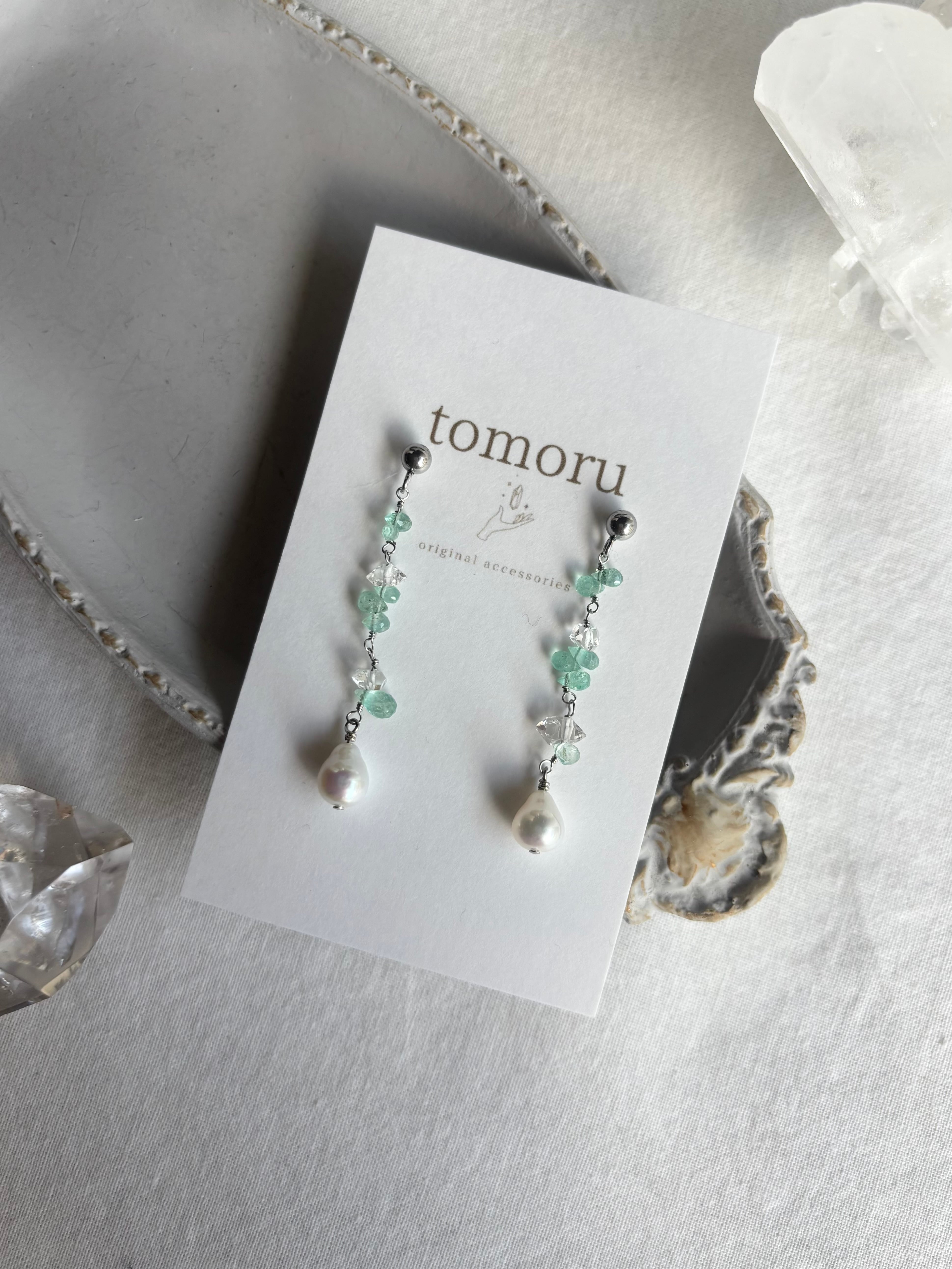 透明度高く優しい色合いのエメラルドと、ハーキマーダイヤモンドの輝きが爽やかに顔まわりを明るくしてくれます。