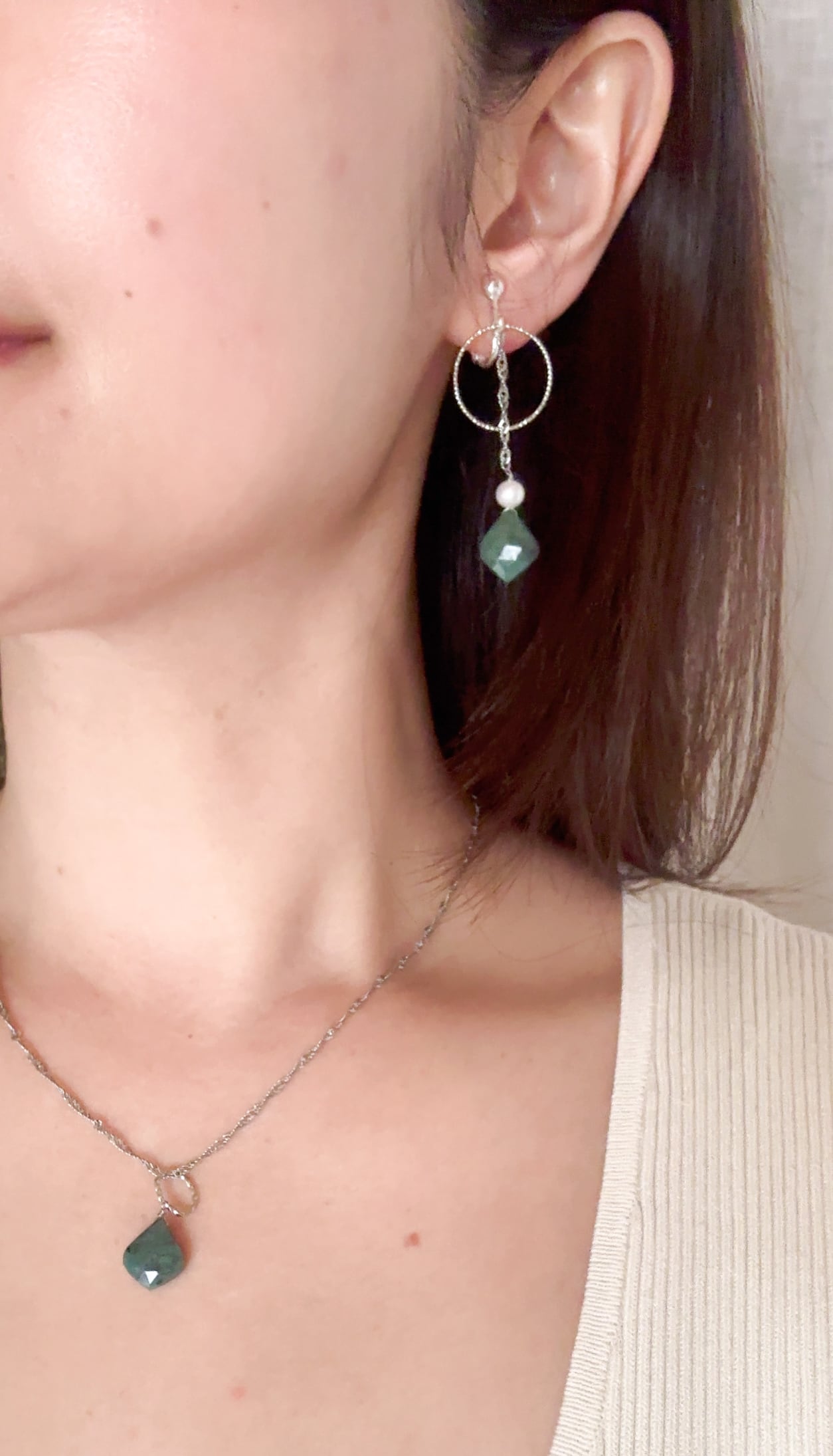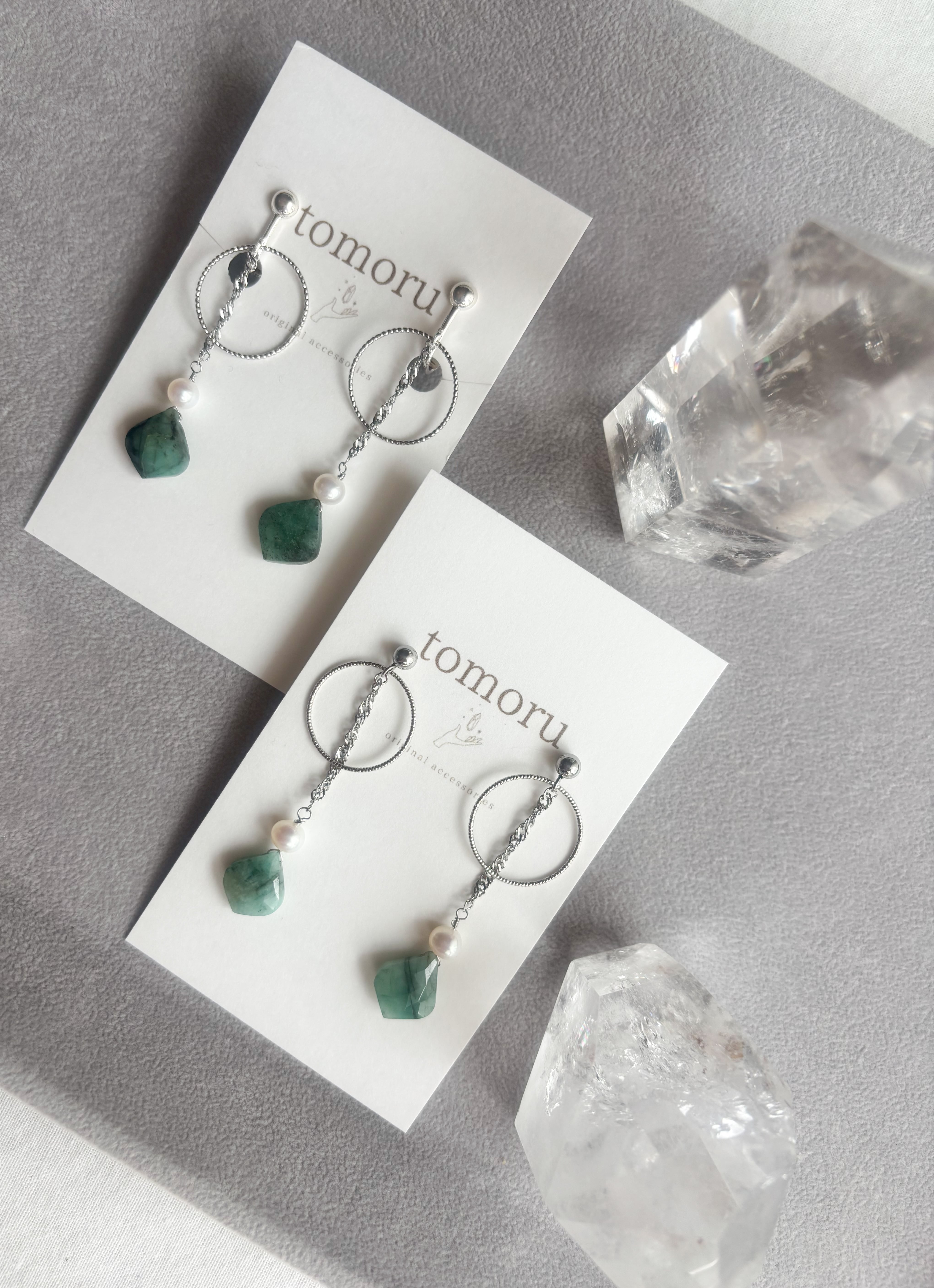 【NEW】エメラルド×淡水パールのフープチェーンピアスイヤリング