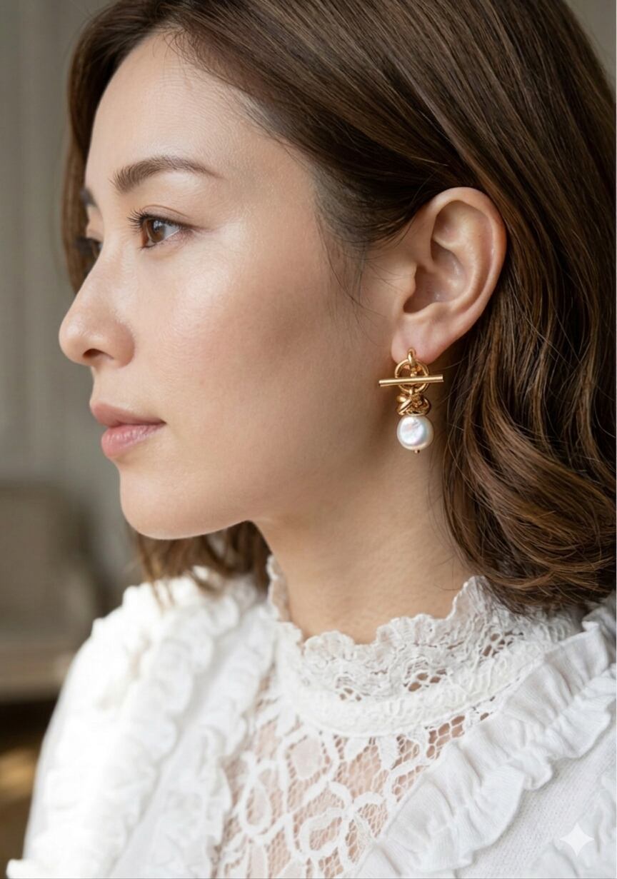 ころんと可愛いコイン型の淡水パールと合わせて、カジュアルな大人可愛い雰囲気に仕上げました。何にでも合わせやすく、私も日常的によく使っている一点です。