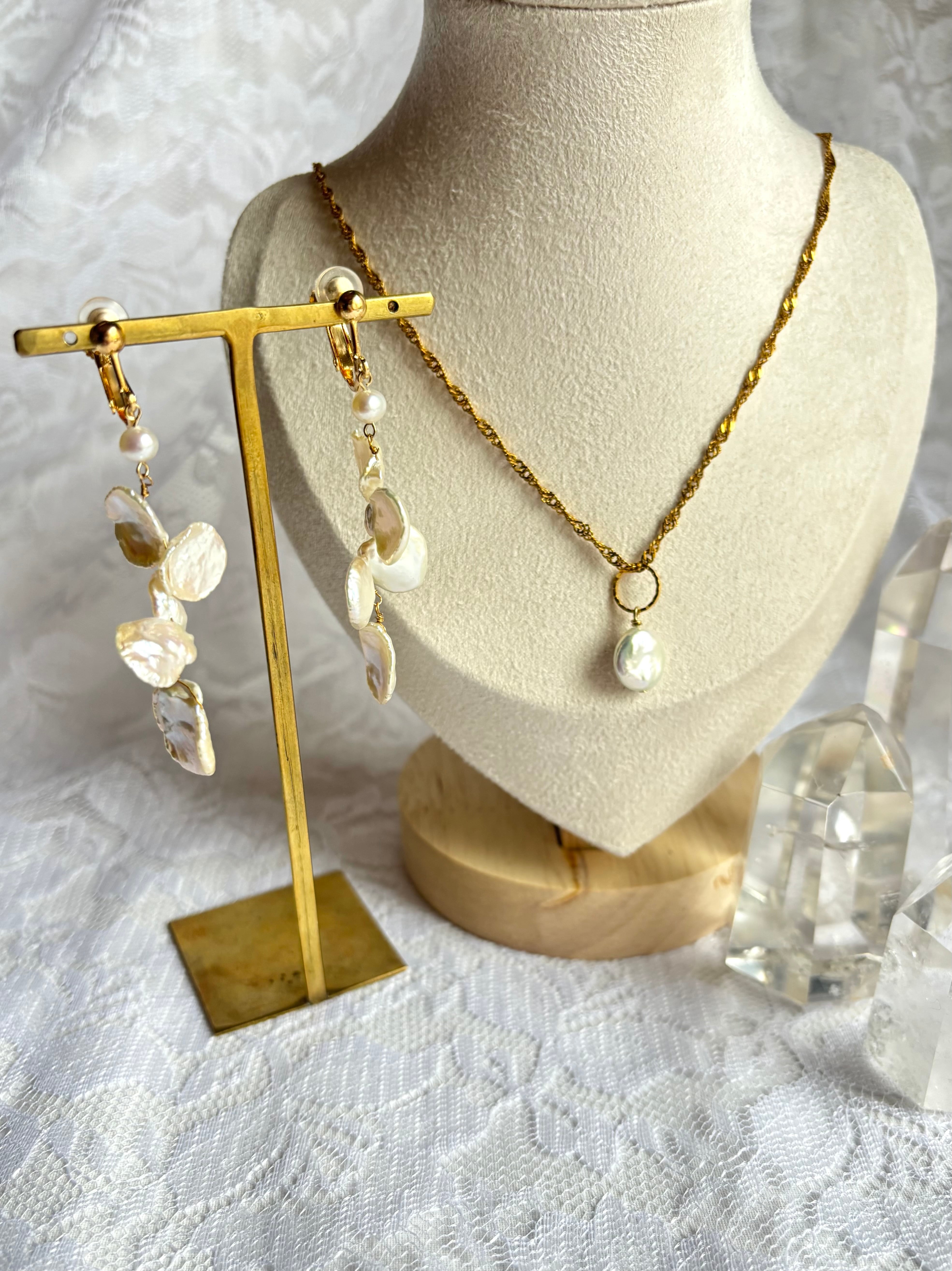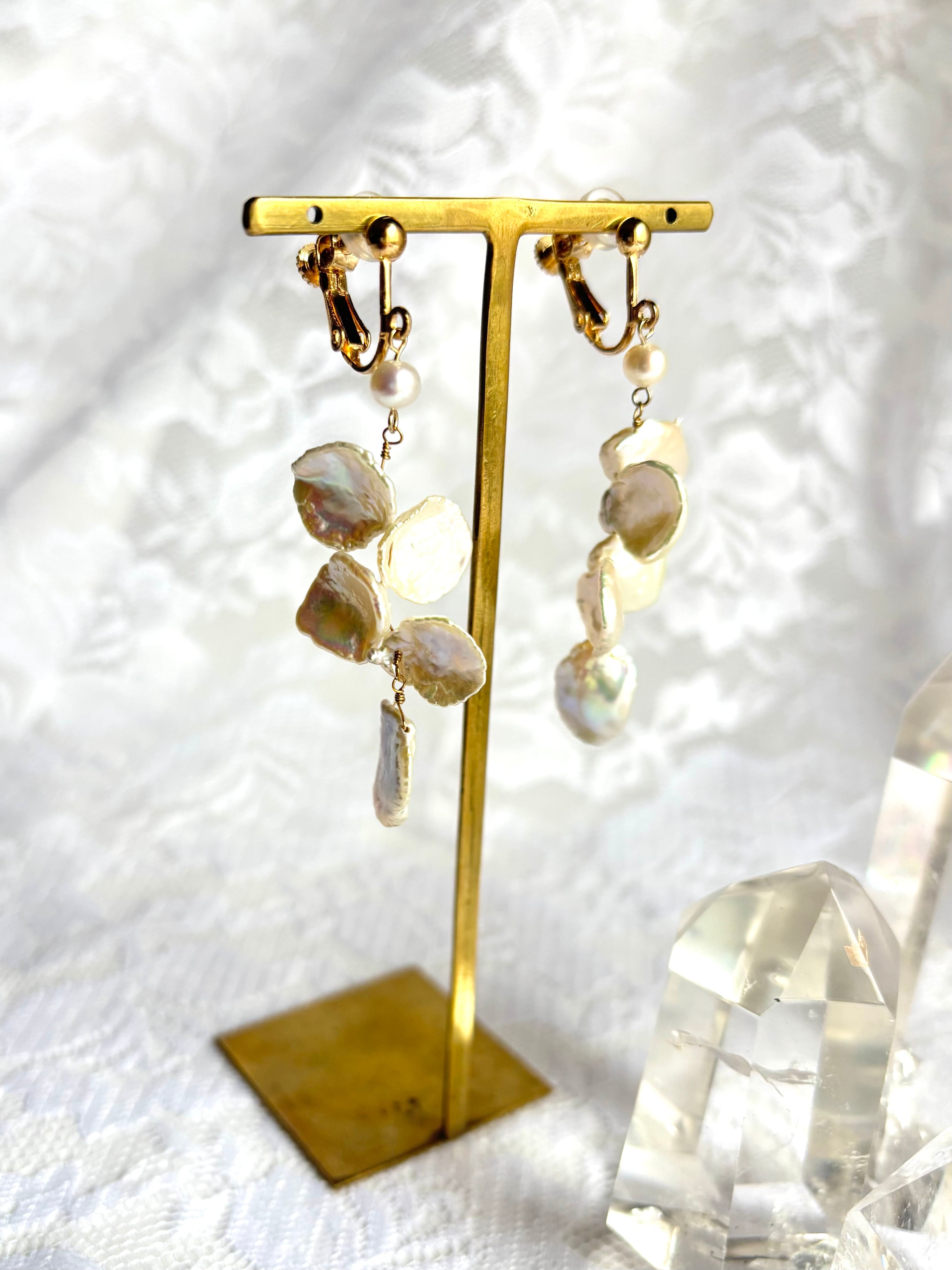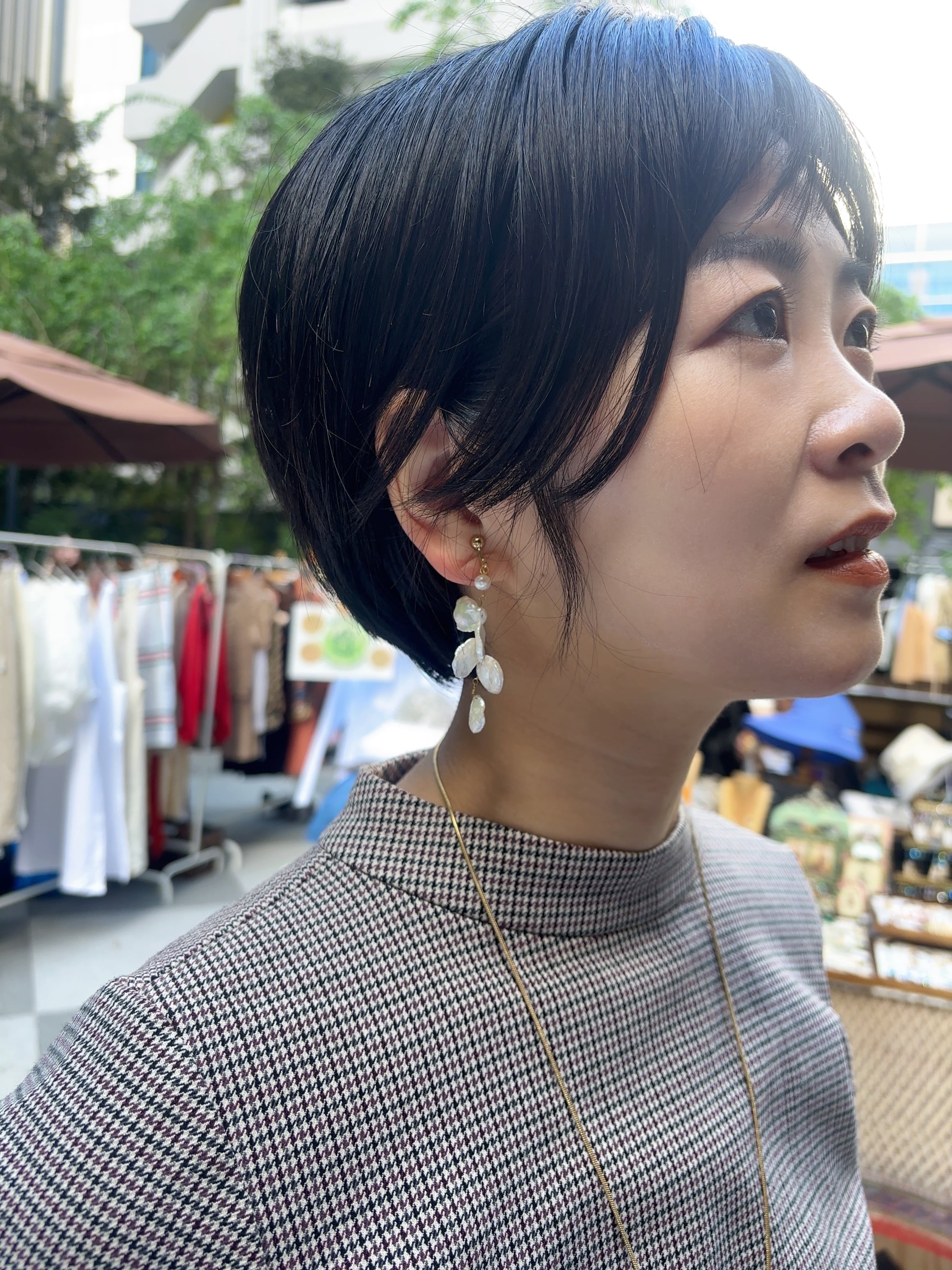 花びらのような形のケシパールが大人かわいいアクセサリーです。風にヒラヒラと揺れる姿は本当に花びらを纏っているよう♡