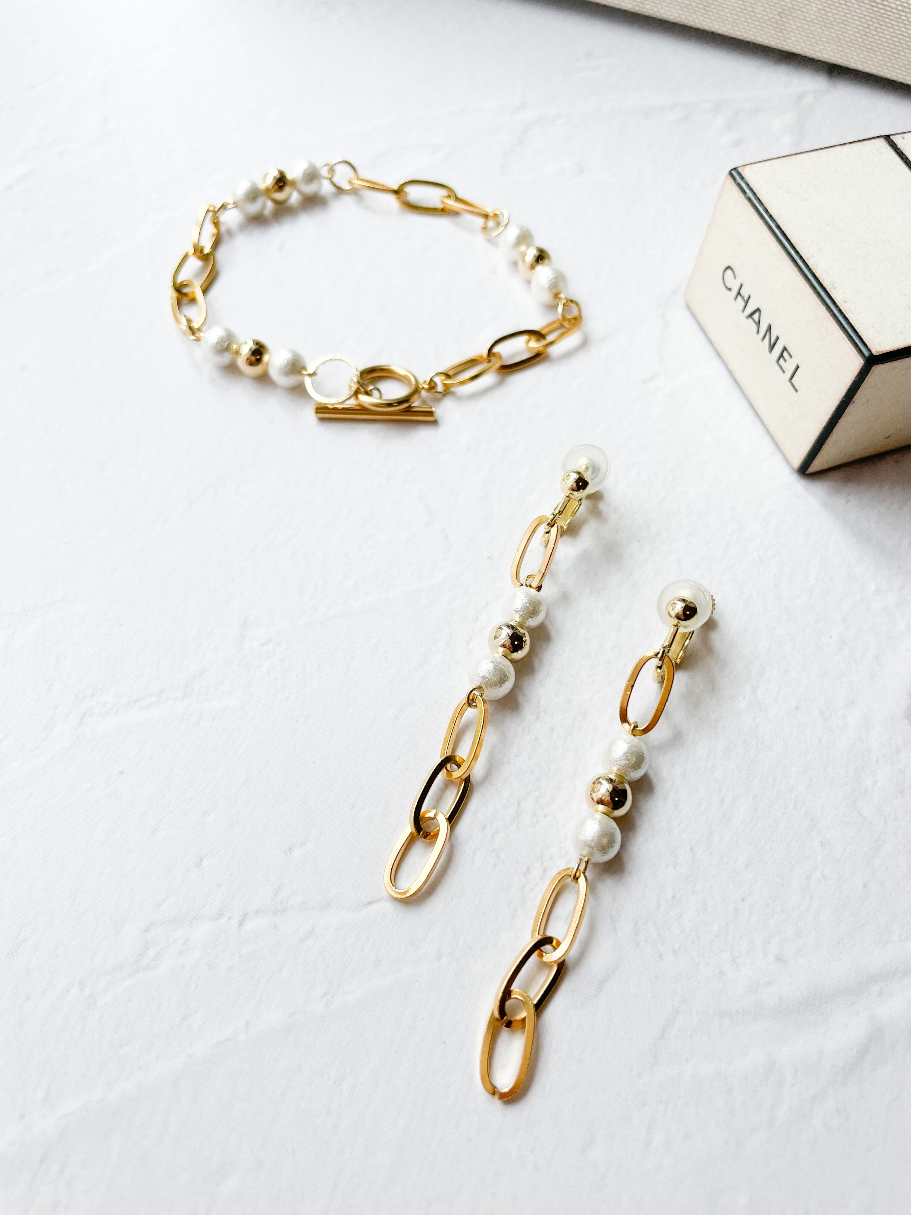 【アリー】ゴールドチェーンとコットンパールの揺れるピアス
