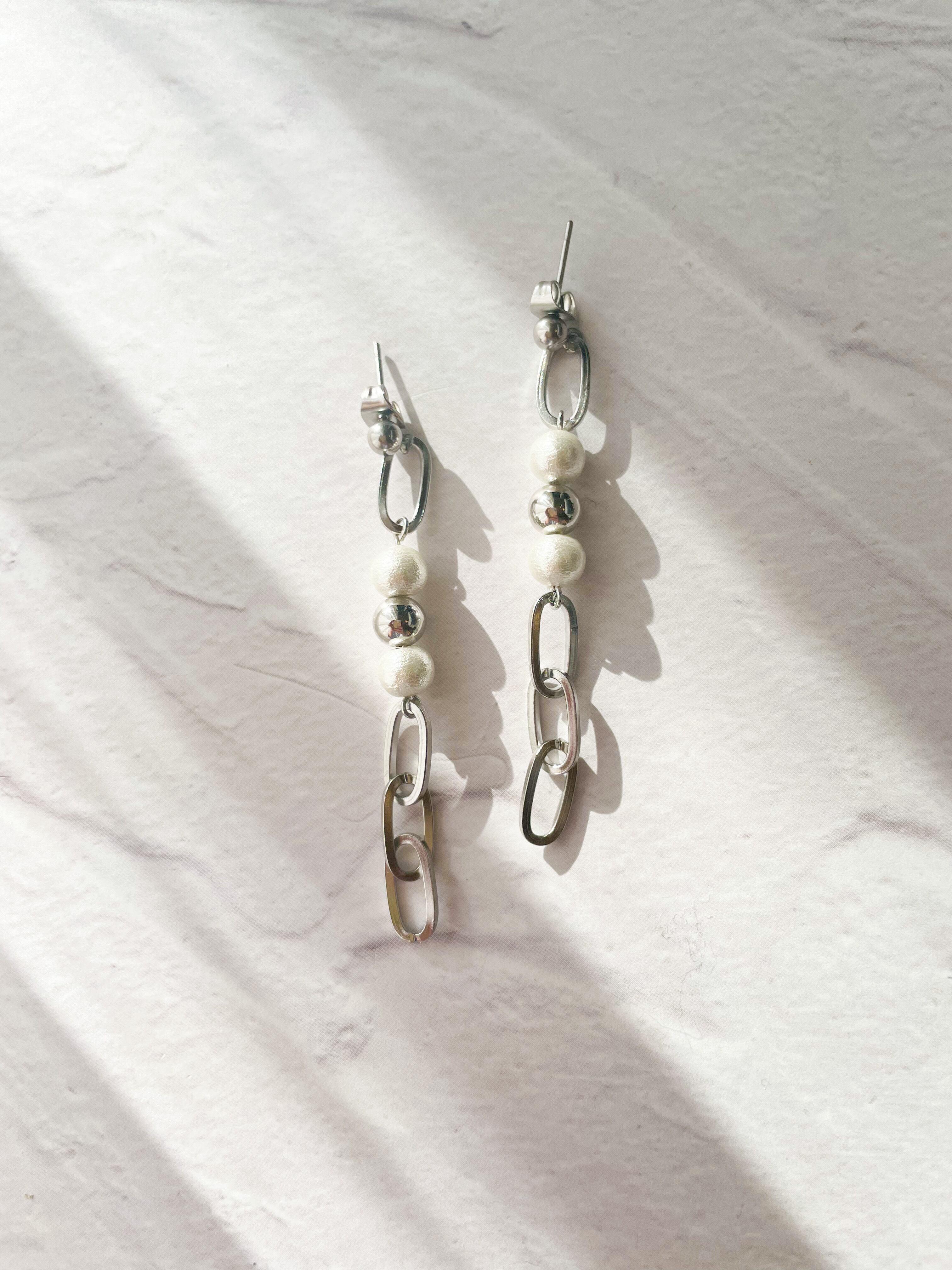 【アリー】シルバー・オーバルチェーンとコットンパールの揺れるピアス