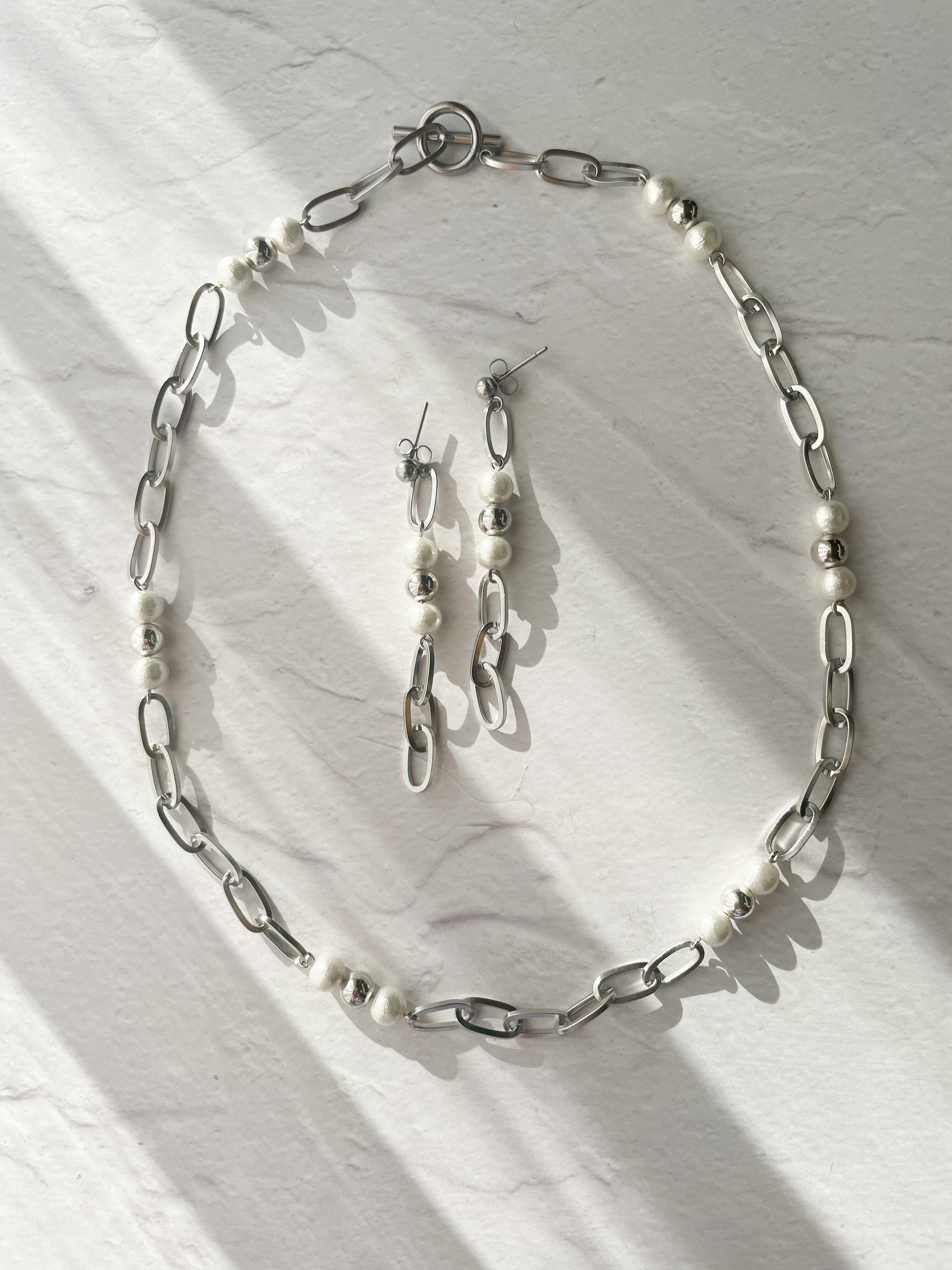 【アリーシリーズ】オーバルシルバーチェーンとコットンパールのネックレス