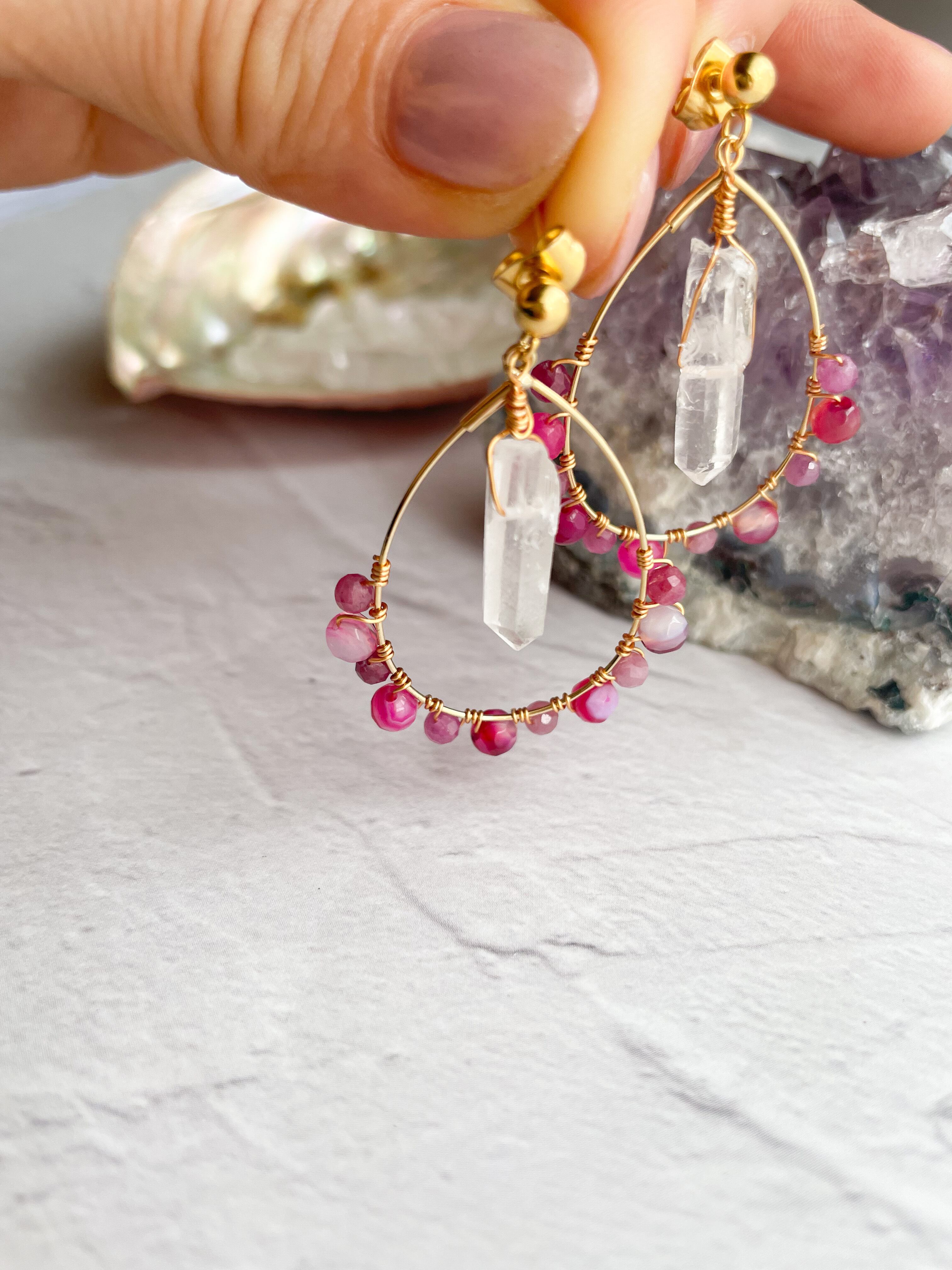 天然石・女帝ルビーと氷柱クリスタルフープピアスイヤリング