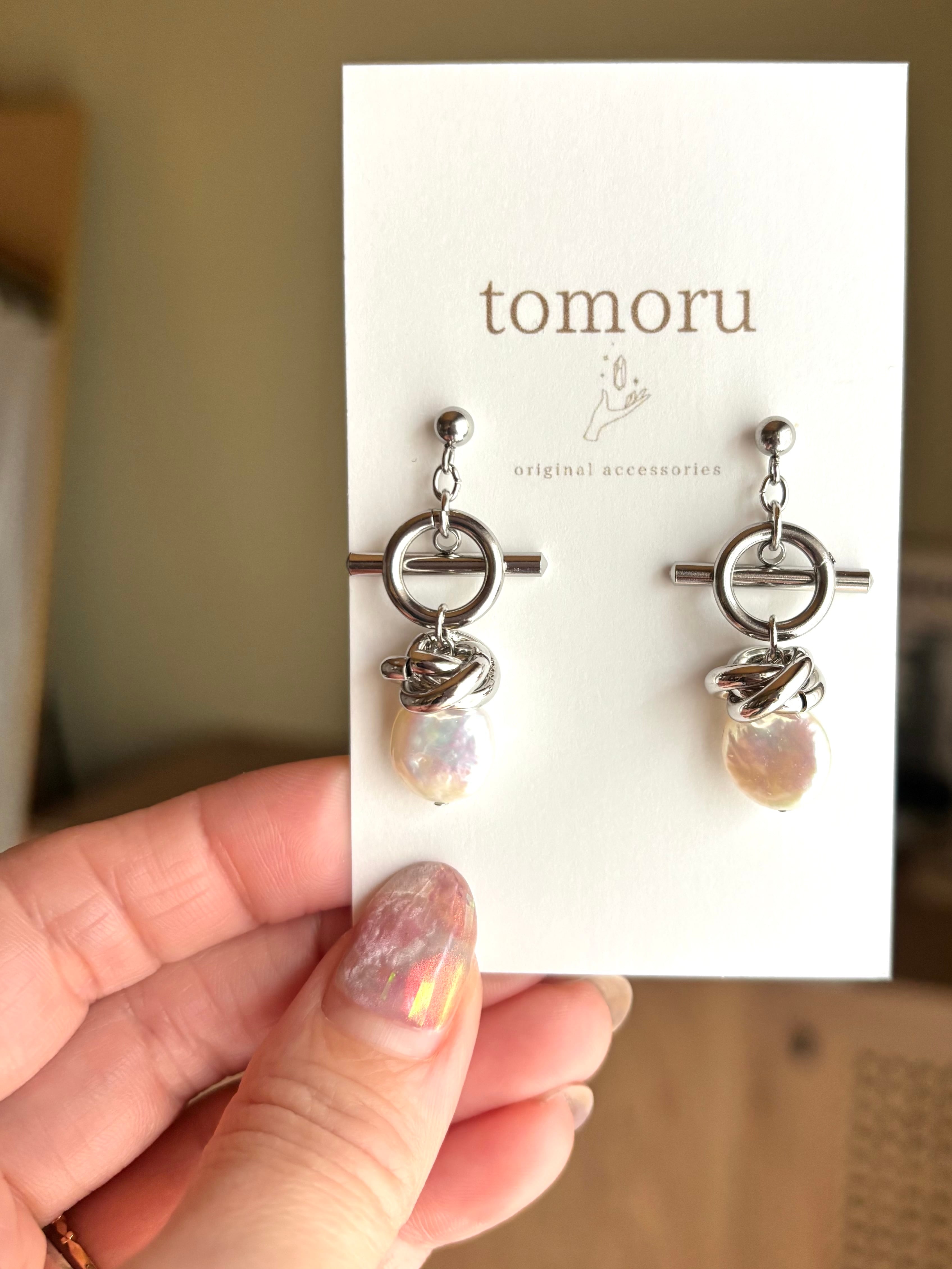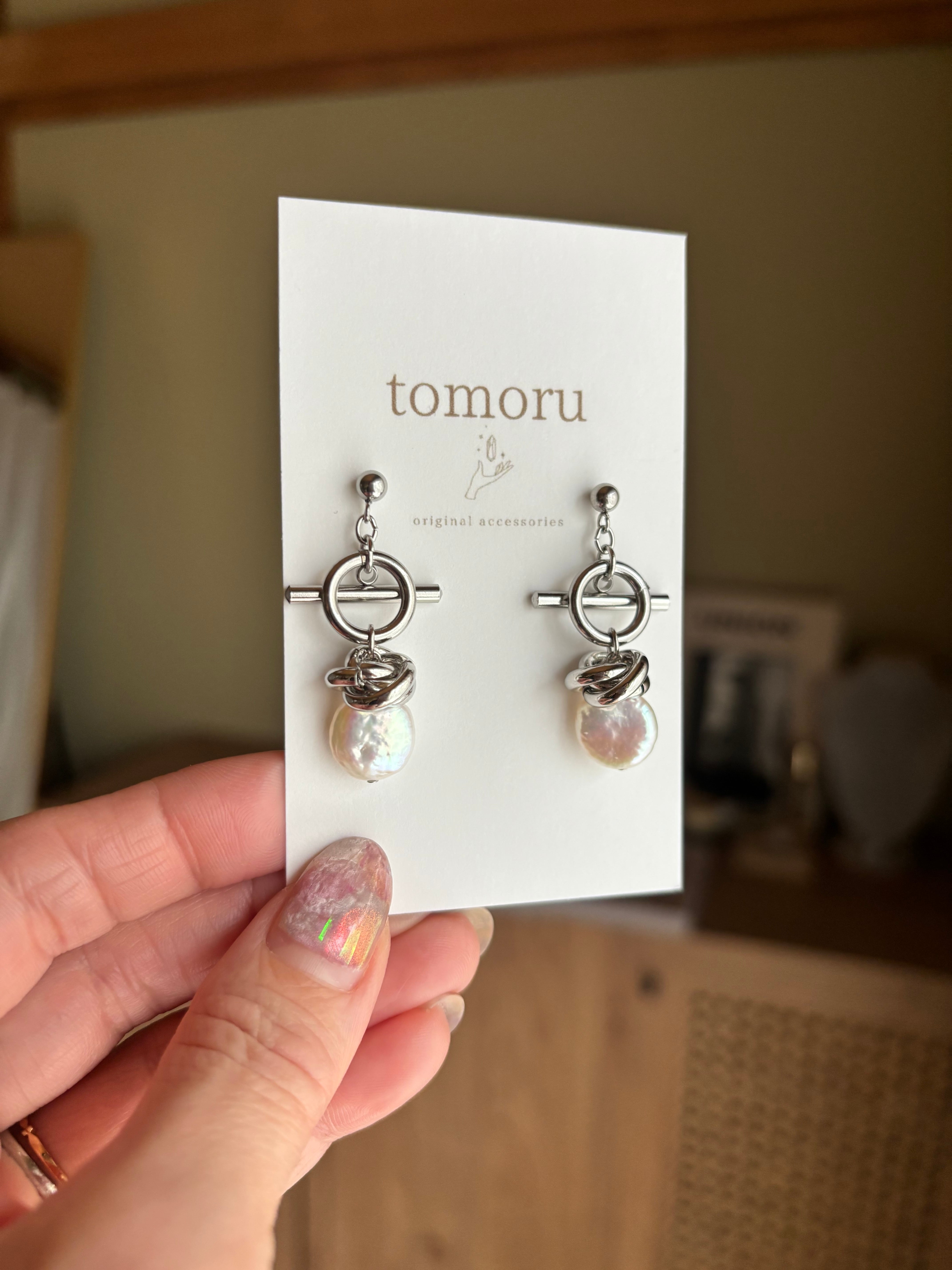 ころんと可愛いコイン型の淡水パールと合わせて、カジュアルな大人可愛い雰囲気に仕上げました。何にでも合わせやすく、私も日常的によく使っている一点です。